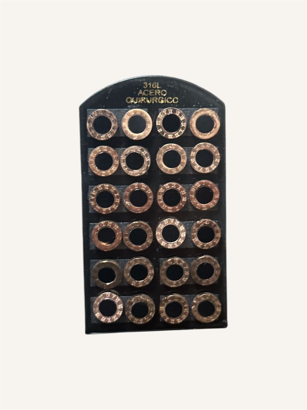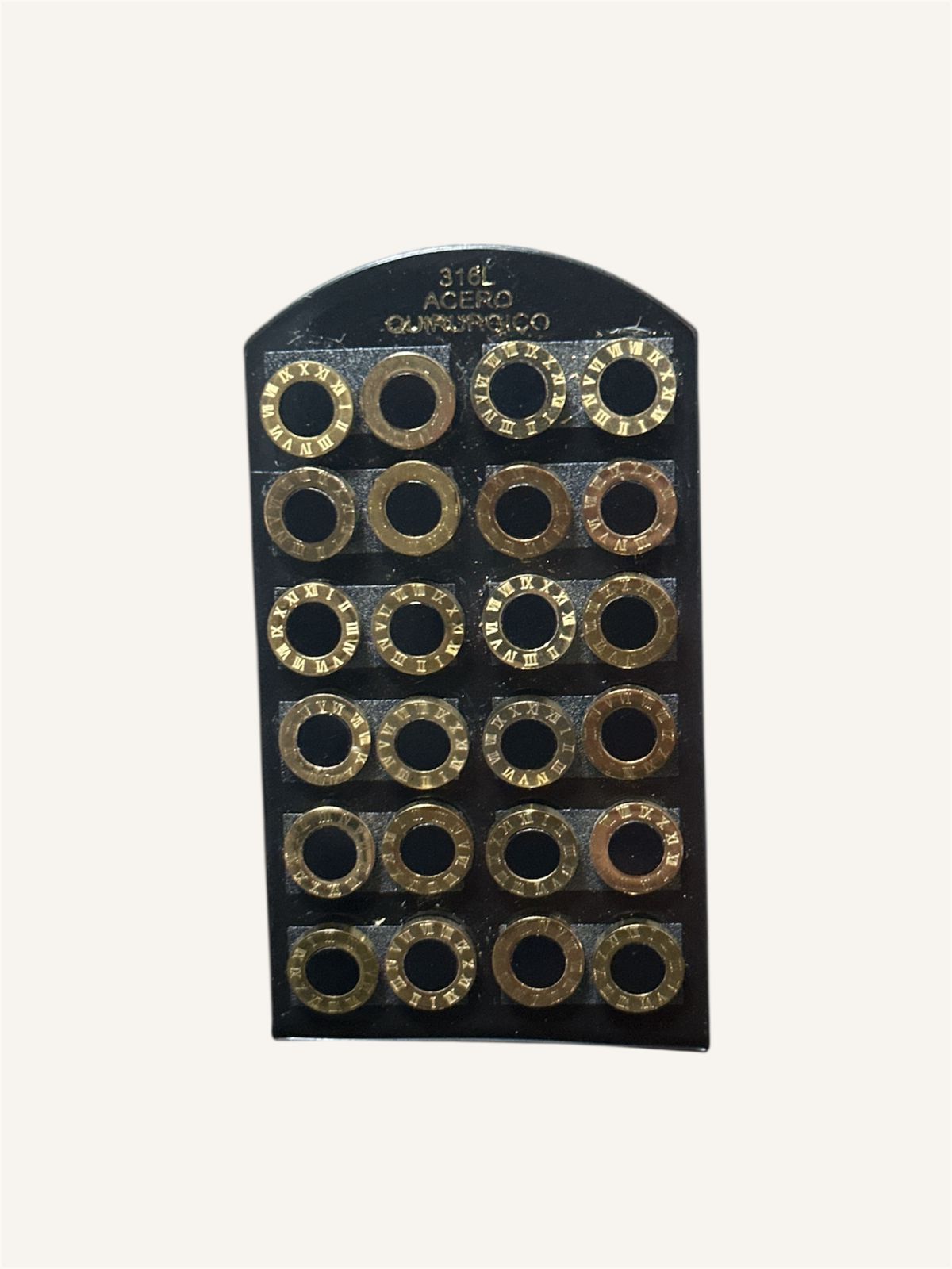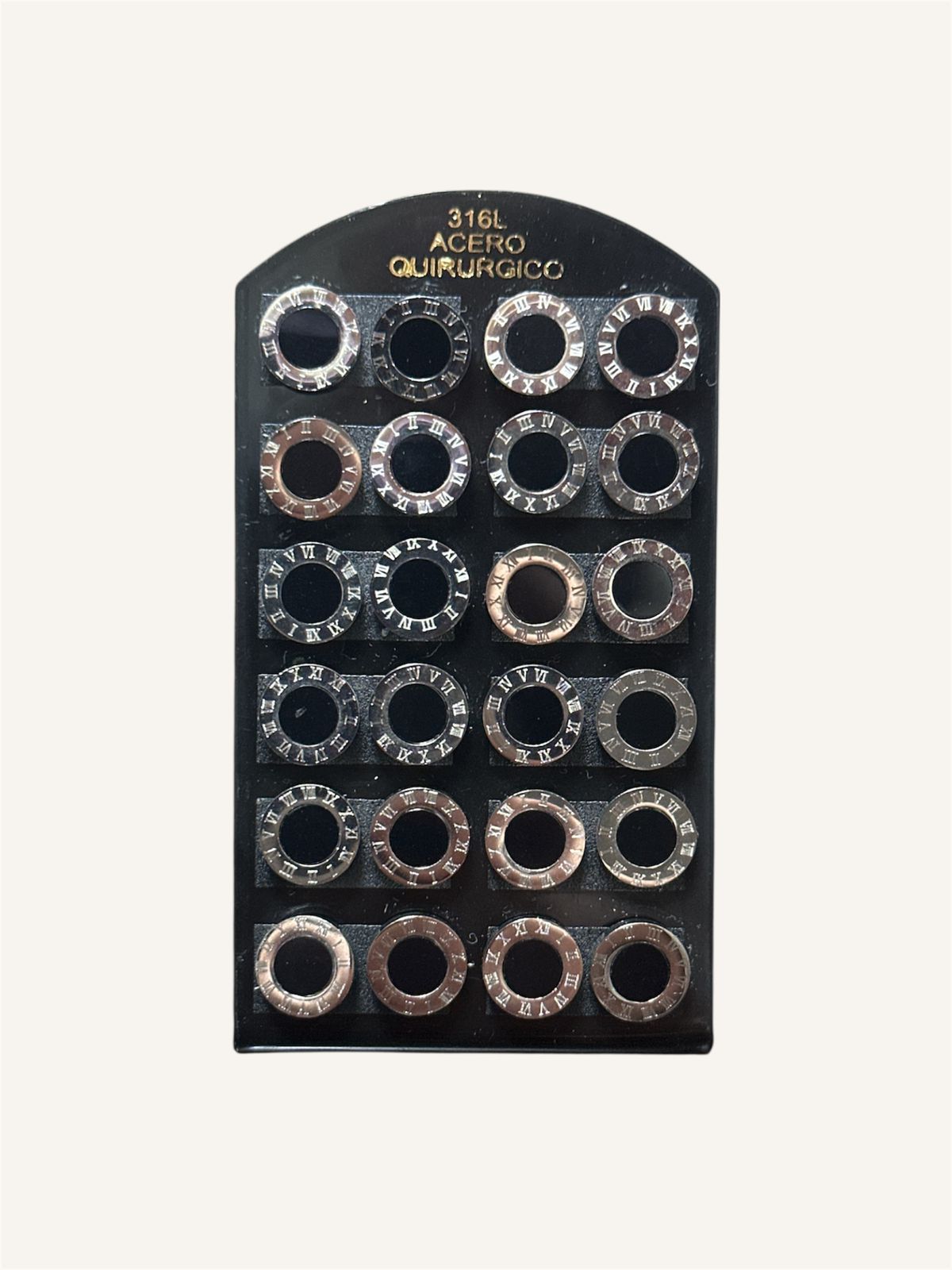 blíster cerrado, trae 12 pares en total. Modelos surtidos.Material: acero quirúrgico (en algunos modelos los colgantes son de cobre)
