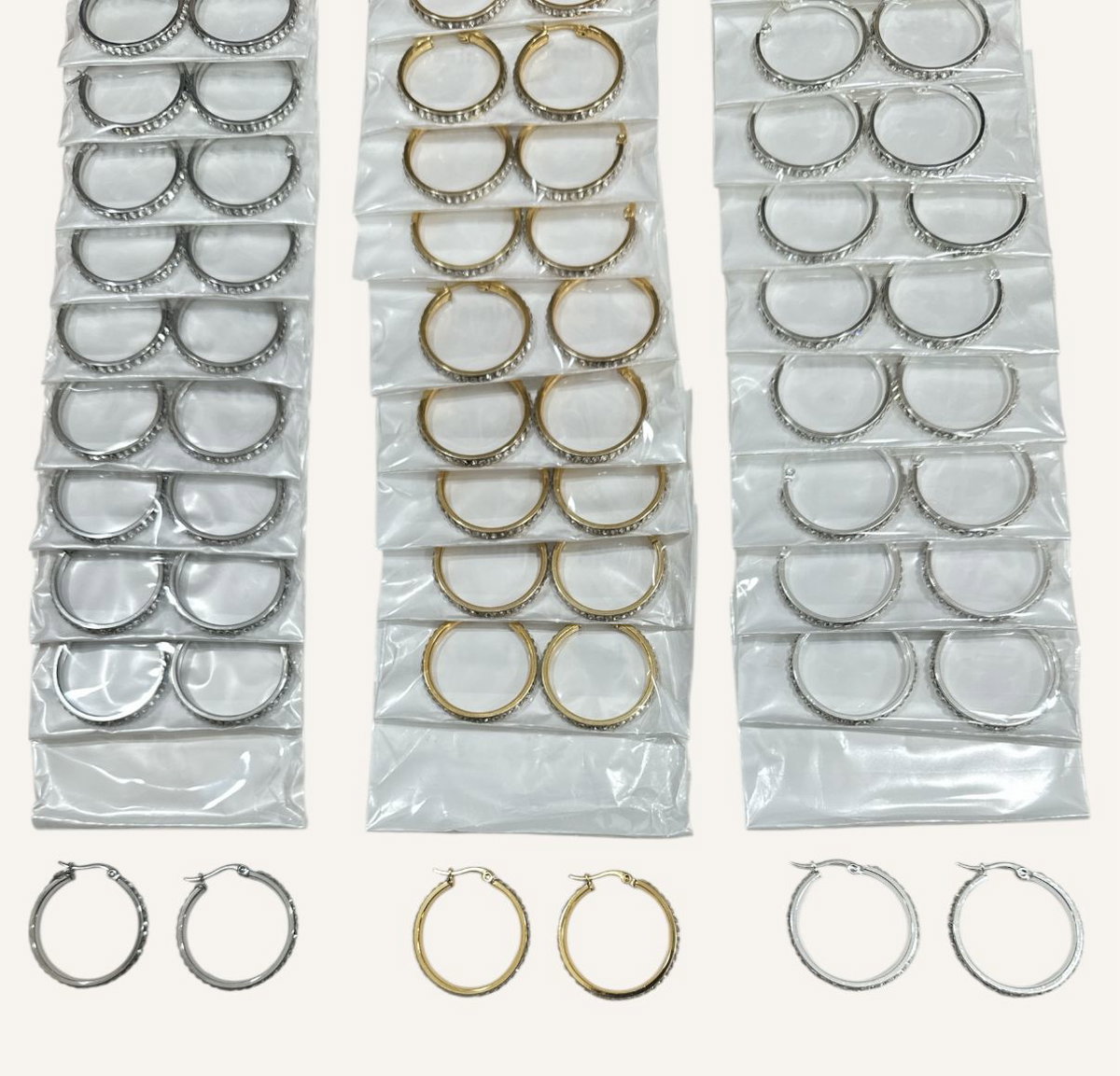 Aros por tira, trae 12 pares en total. Modelos como en la foto.