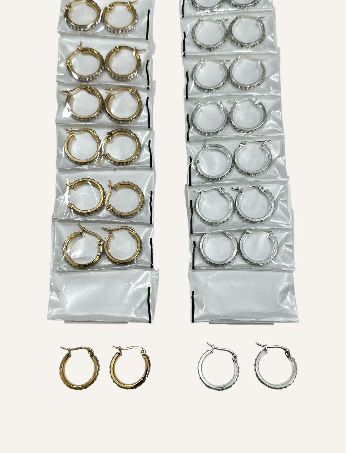 Aros por tira, trae 12 pares en total. Modelos como en la foto.