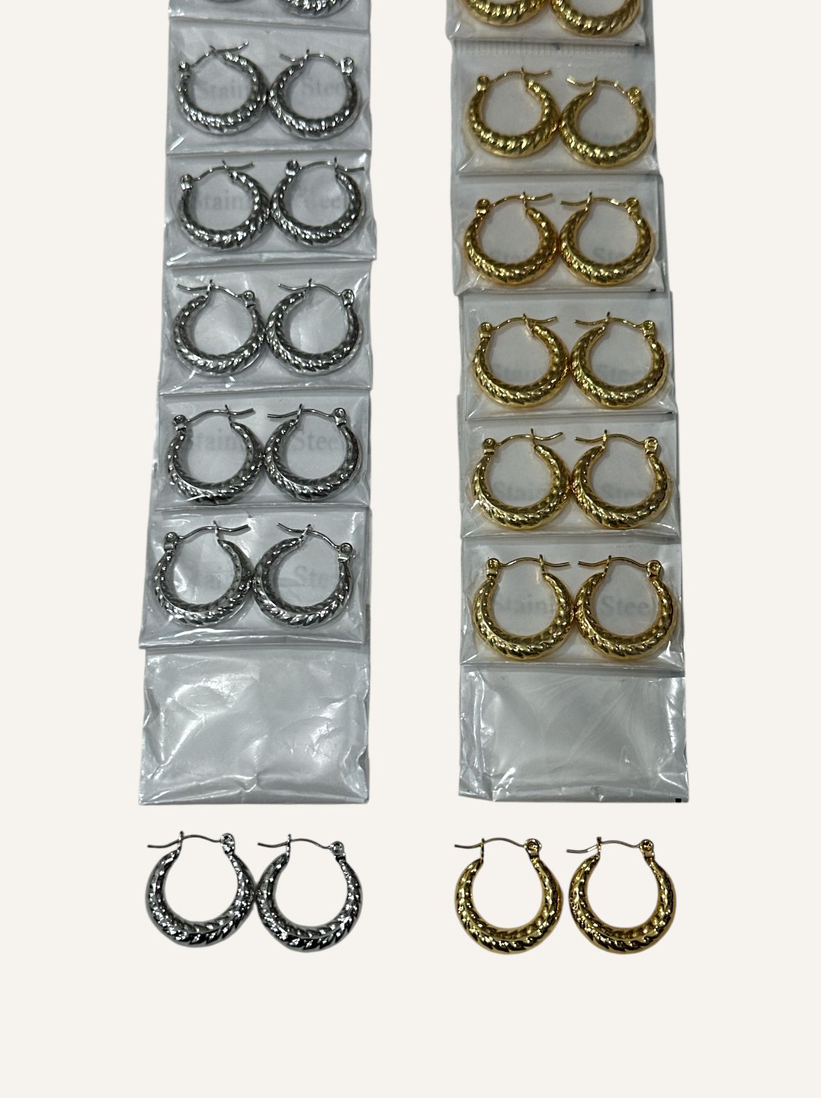Aros por tira, trae 12 pares en total. Modelos como en la foto.
