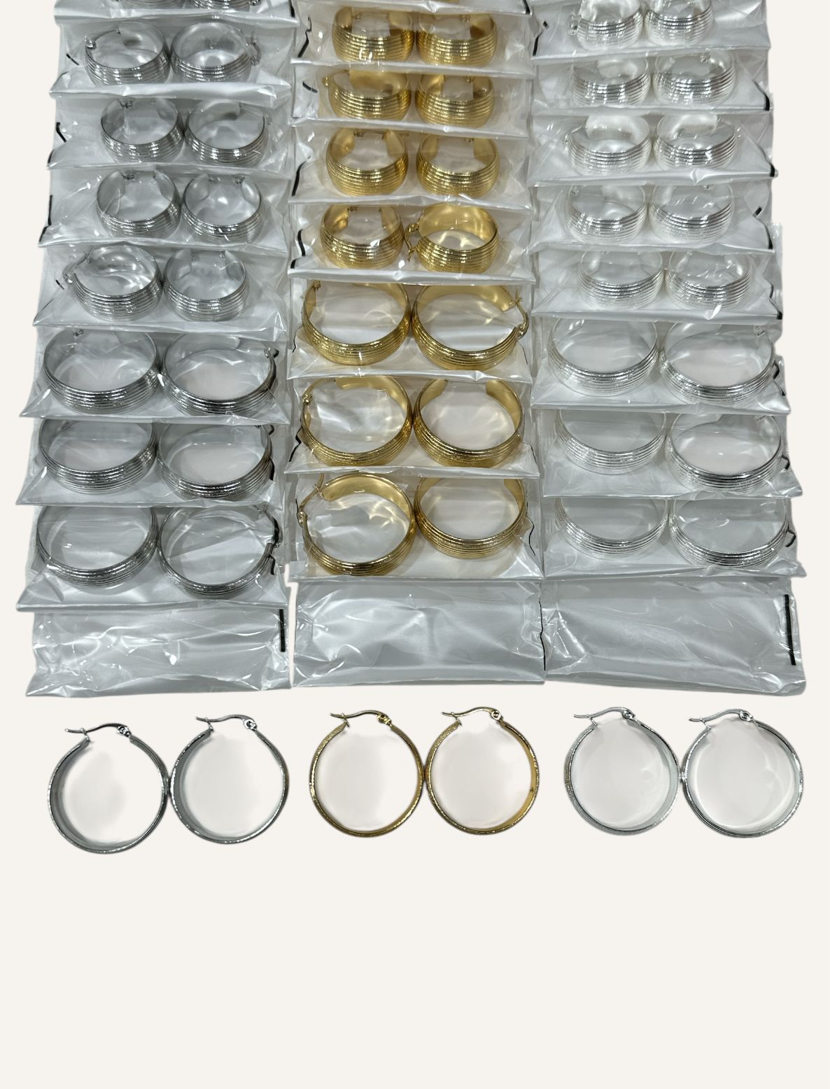 Aros por tira, trae 12 pares en total. Modelos como en la foto.