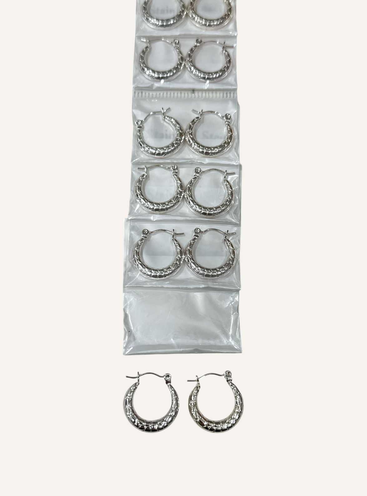 Aros por tira, trae 12 pares en total. Modelos como en la foto.